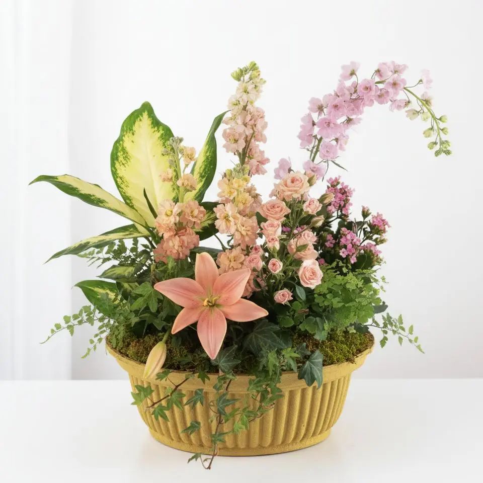 Experience pure tranquility with 'Peach Petal Serenity', a breathtaking arrangement blending soft peach and pink blooms with lush greenery. This harmonious floral display, nestled in a charming paper-mache container, brings a refreshing sense of calm and natural elegance to any space. Elevate your home or gift a moment of serene beauty.